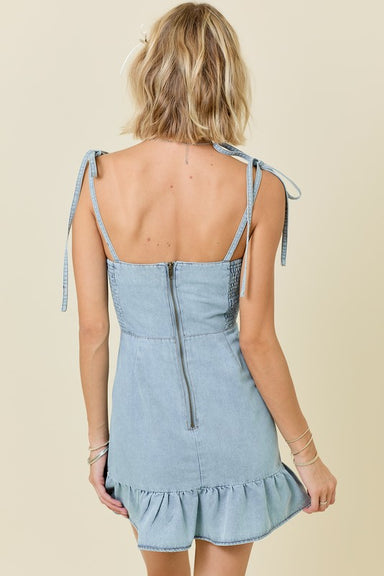 Features: Tie straps Smocking on back Sweetheart neckline Ruffle hem Zipper on back