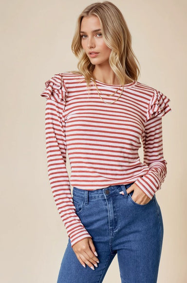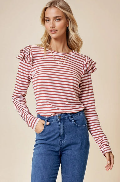 Features: Ruffle on shoulder Striped design Mock neck Fitted silhouette 46% Cotton, 46% Polyester, 8% Spandex